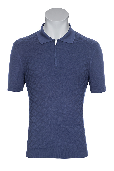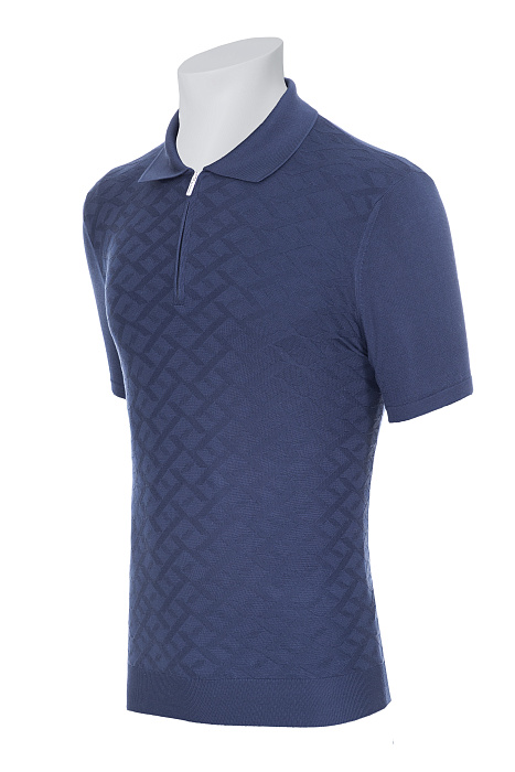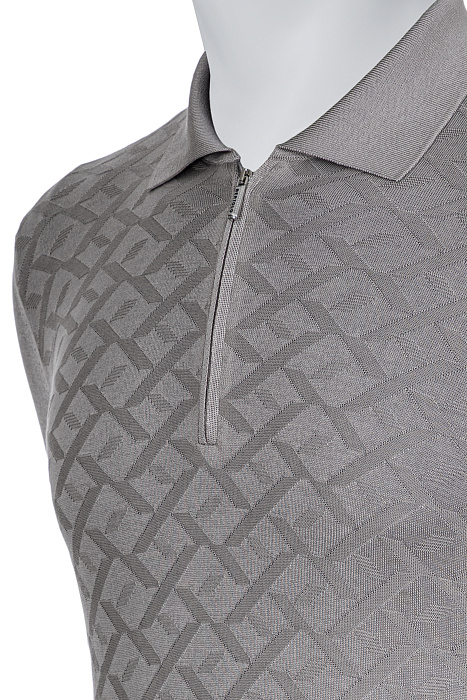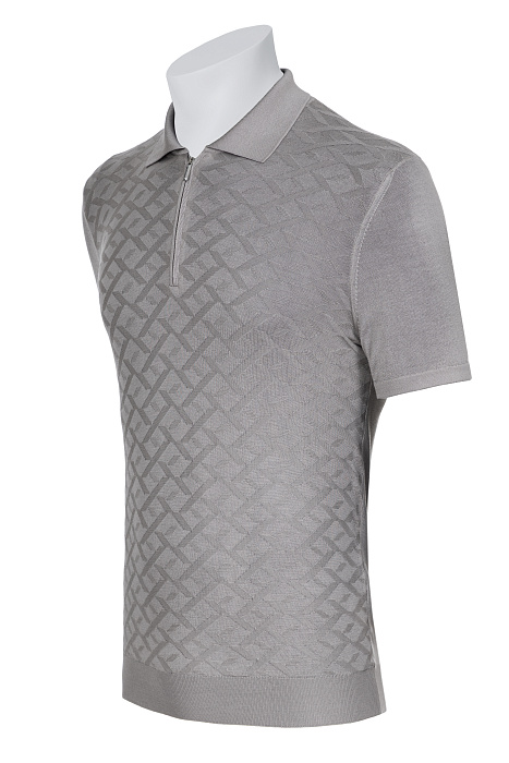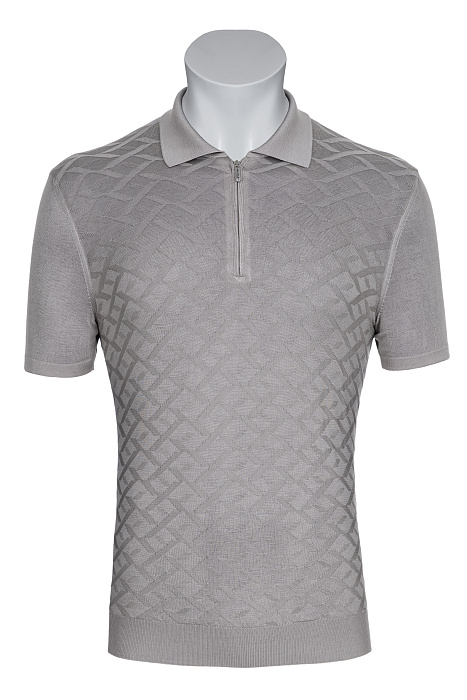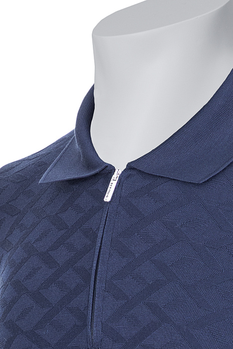 Կարճաթև տրիկոտաժե պոլո՝ դասական օձիքով և կայծակաճարմանդով, պատրաստված նուրբ հյուսվածքով և երկրաչափական ժակարդային նախշով, լրացված էլաստիկ թևքավոր եզրերով և կոկիկ ներքևի եզրագծով՝ ժամանակակից նրբաճաշակ առօրյա կերպարի համար։