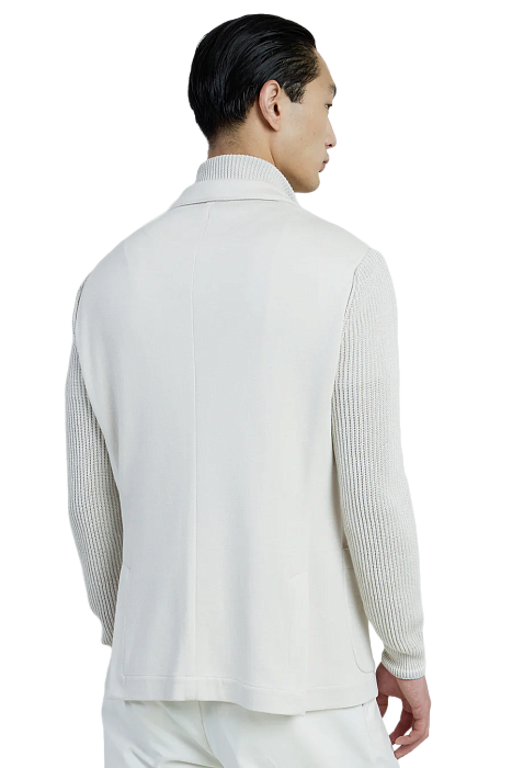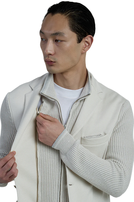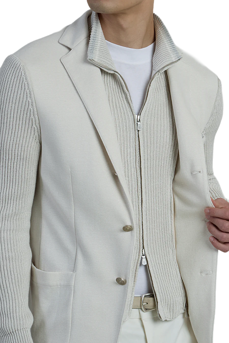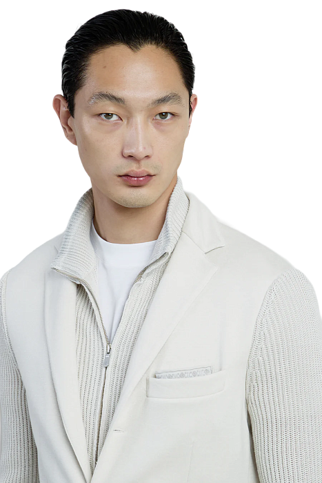 Eleventy պիջակ՝ տրիկոտաժե ներդիրով և կայծակաճարմանդով, նրբագեղ դասական силуэтով, որը համադրում է իտալական բարձրորակ պատրաստումը, պրեմիում նյութերն ու ժամանակակից էլեգանտ smart-casual ոճը։