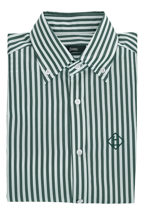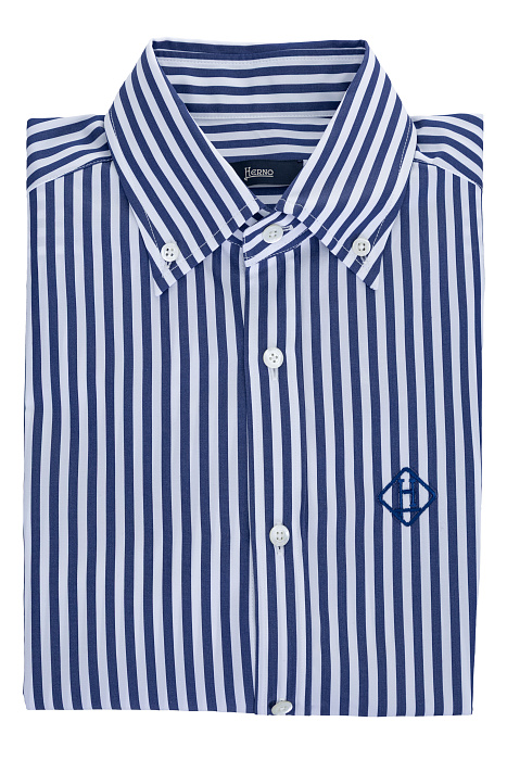 Herno գծավոր վերնաշապիկ՝ button-down օձիքով, դասական ուրվագծով, կոճակներով փակումով և կրծքի հատվածում ասեղնագործ լոգոտիպով, համադրելով ժամանակակից դասական ձևավորումը իտալական նրբաճաշակ ոճի հետ։