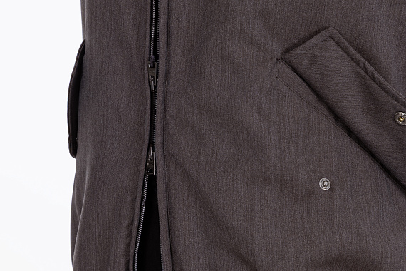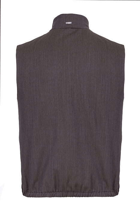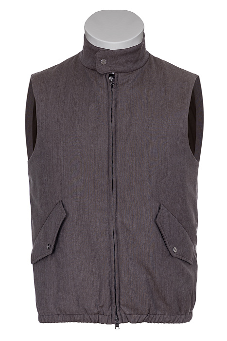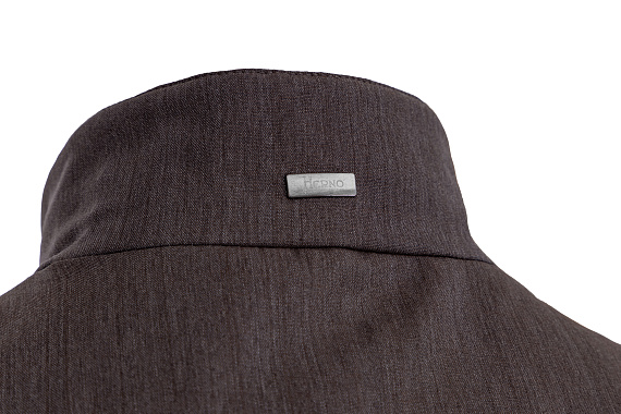 Herno անթև ժիլետ՝ բարձր օձիքով, ուղիղ մաքուր ուրվագծով, փականով կայծակաճարմանդով և փականավոր գրպաններով, համադրելով գործնական վերնահագուստի տարրերը իտալական մինիմալիստական նրբաճաշակ ձևավորման հետ։