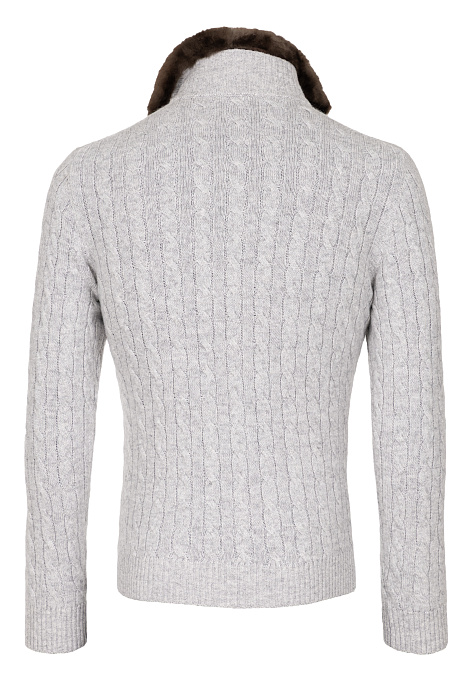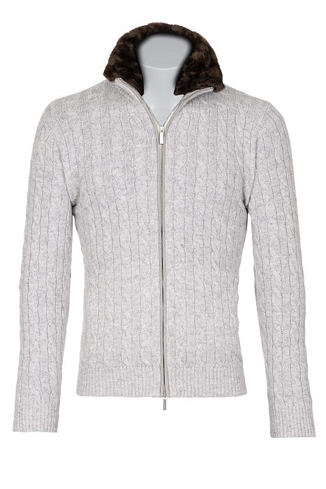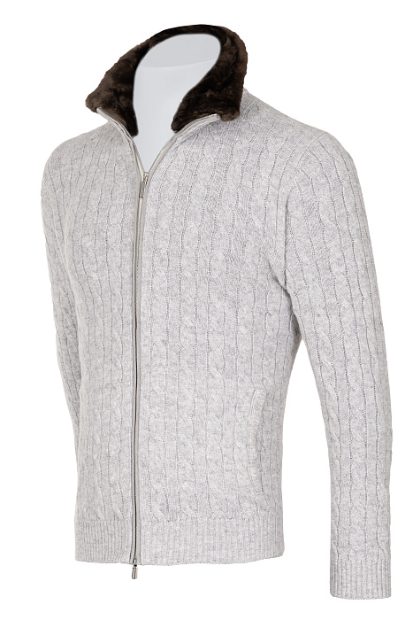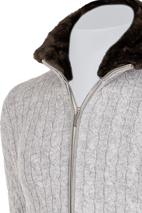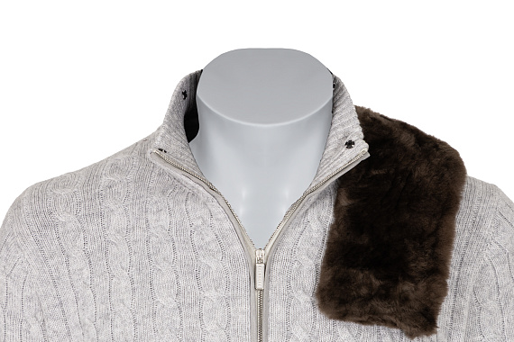 Կայծակաճարմանդով կարդիգան՝ պատրաստված մաքուր քեշմիրից, «հյուսվածք» նմուշով և ներքին մորթյա օձիքով։ Հարմարավետության, ջերմության և անթերի ոճի օրինակ։