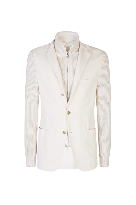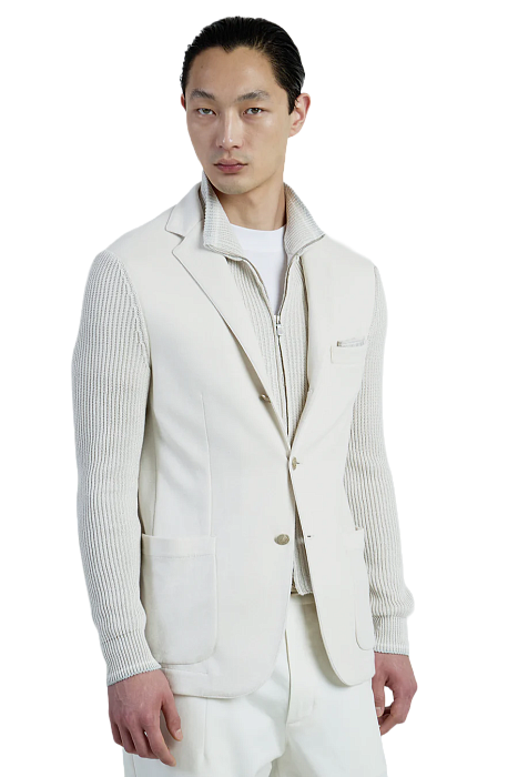 Eleventy պիջակ՝ տրիկոտաժե ներդիրով և կայծակաճարմանդով, նրբագեղ դասական силуэтով, որը համադրում է իտալական բարձրորակ պատրաստումը, պրեմիում նյութերն ու ժամանակակից էլեգանտ smart-casual ոճը։