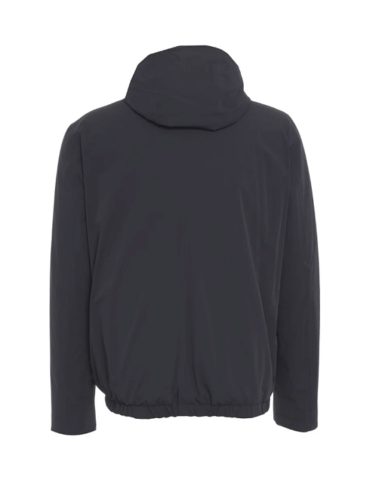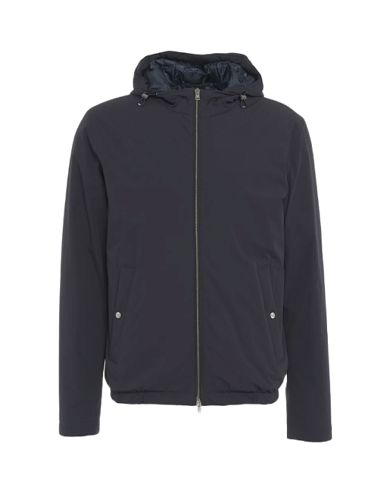 Short jacket by Herno, crafted from a high-performance technical blend. The lightweight fabric with stretch ensures comfortable wear and freedom of movement. The model features a central zip fastening, side welt pockets with snap buttons, elasticated hem and cuffs, and an integrated hood with adjustable drawstrings. Fully lined for optimal protection.