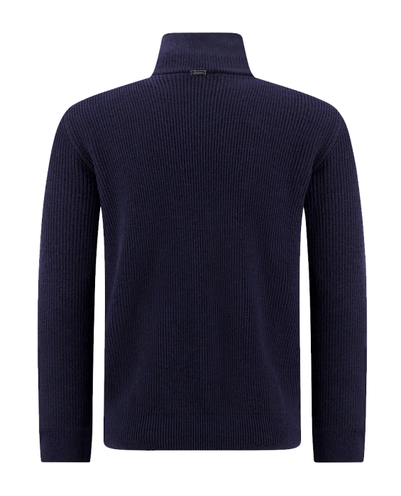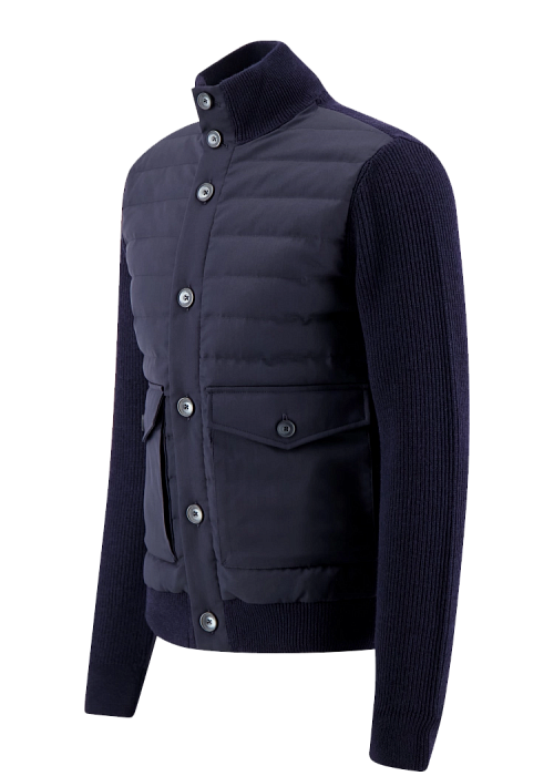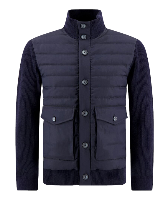 Knitted jacket by Herno made from a soft blend of wool, polyester, and elastane. The front panel features quilted technical fabric with warm padding and a full button closure. Designed with a stand-up collar, large flap pockets, and ribbed knit sleeves and back for added flexibility and comfort. A versatile piece that merges the coziness of a sweater with the functionality of a light outerwear layer.