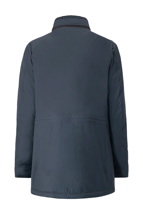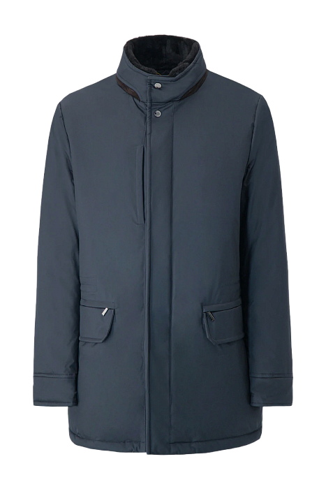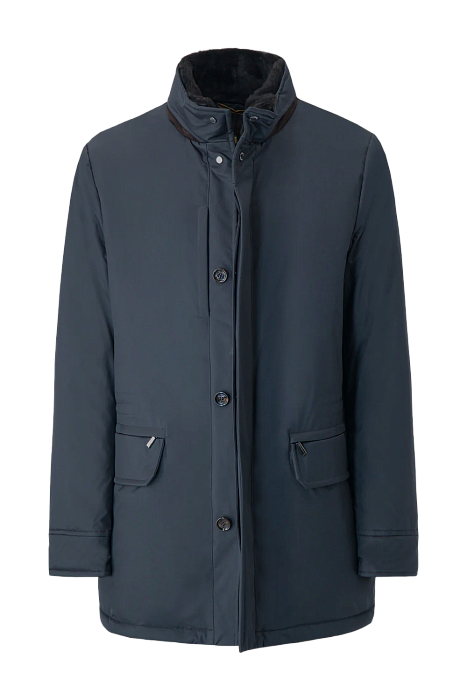 Elegant and highly functional outerwear by Moorer. This men’s mid-length jacket features a clean silhouette with a front placket, high collar, and practical flap pockets. Made from technical fabric with water-repellent properties, it ensures comfort in unpredictable weather. Filled with premium goose feathers for optimal warmth and lightness. A perfect choice for refined winter looks.