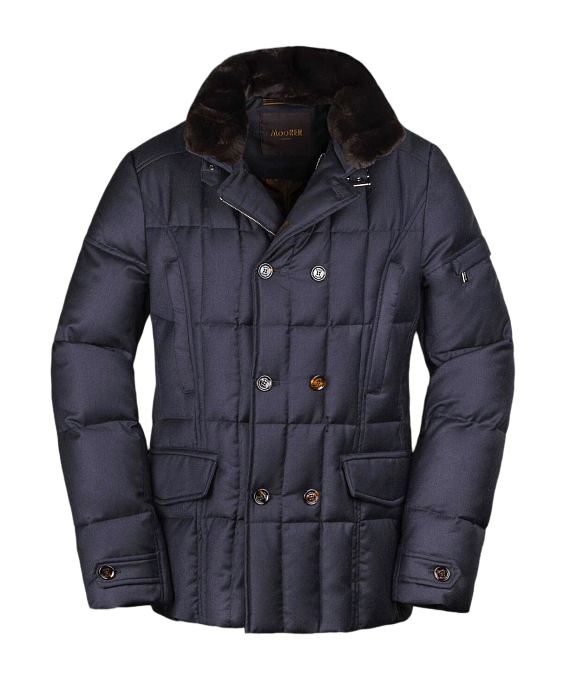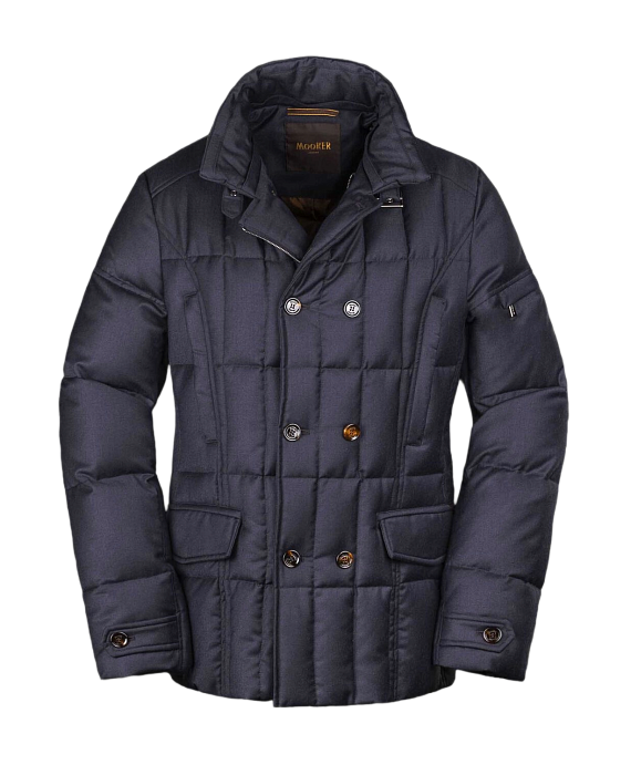 Double-breasted quilted jacket by Moorer, crafted from a luxurious wool and cashmere blend. This elegant outerwear piece features a classic design with a refined fit, insulated for warmth and comfort. Detailed with flap pockets, buttoned cuffs, and a detachable collar insert for versatile styling.