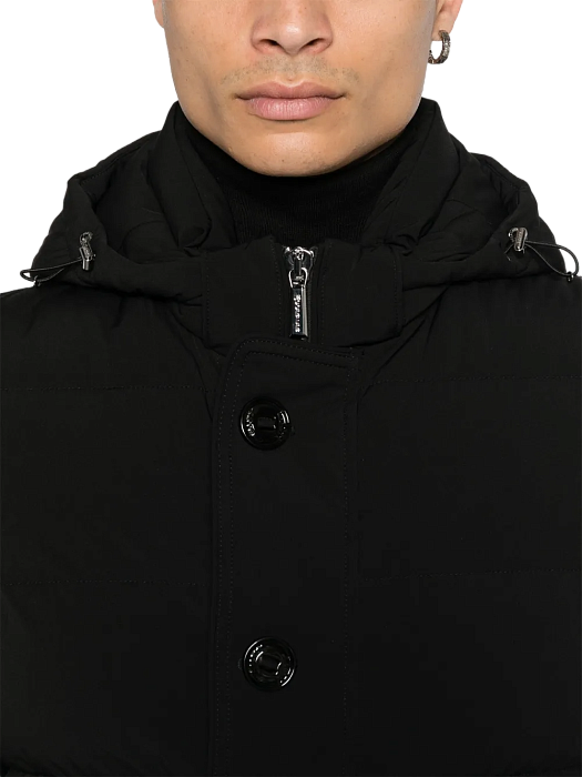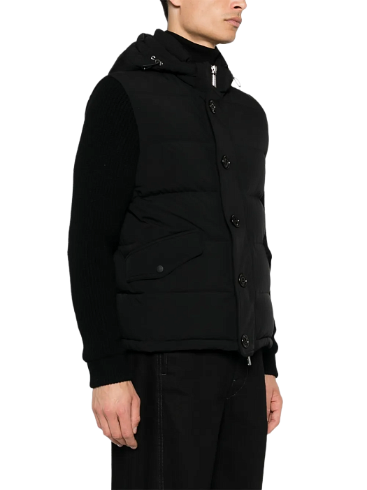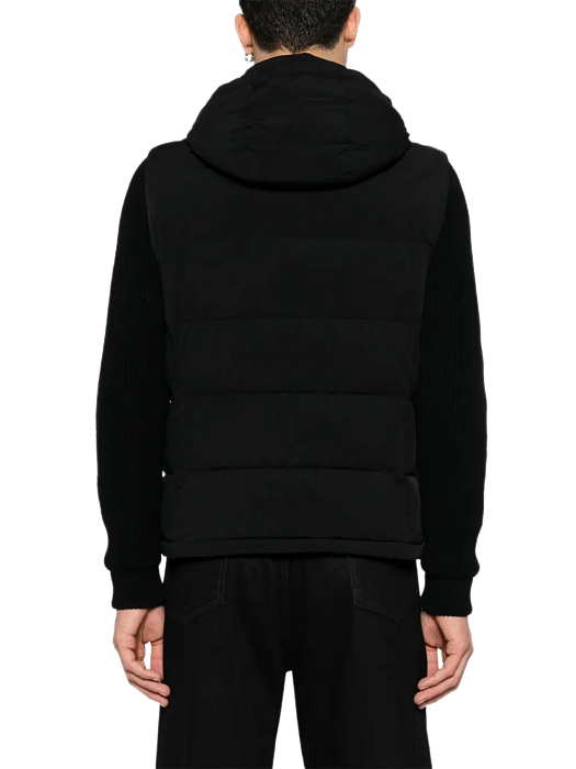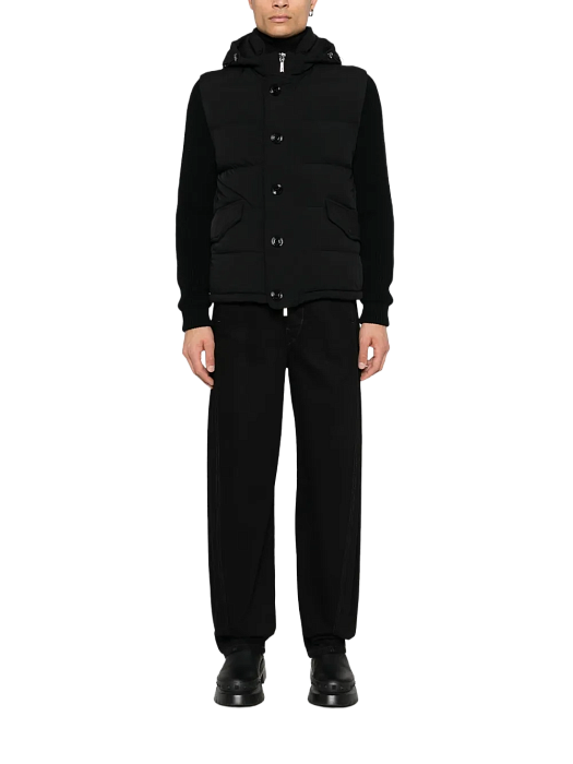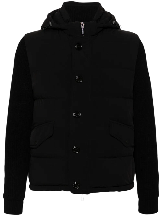 Padded hooded jacket by Moorer crafted from a sophisticated blend of technical and natural fibers. The body is made from quilted fabric with a smooth finish, while the sleeves are knitted in a soft wool-cashmere blend. Front zip and button fastening, ribbed cuffs, and adjustable drawstring hem ensure functionality and comfort. A versatile piece ideal for the transition between seasons.