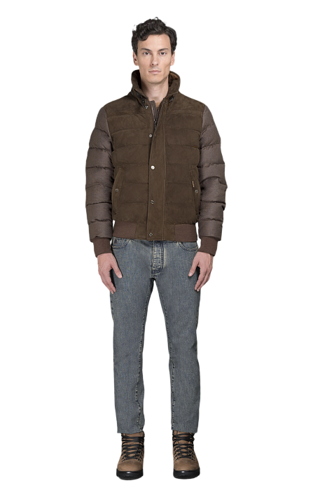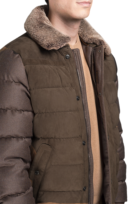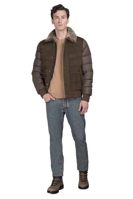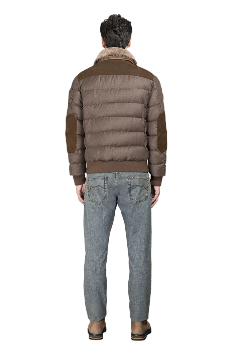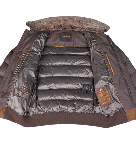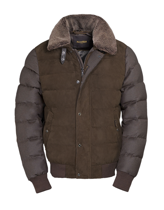 Bomber jacket by Moorer made of genuine lambskin with quilted design. Features knitted cuffs and hem, a zip and snap button closure, and two front flap pockets. The interior is padded and finished with a technical lining and goose down insulation for extra warmth. The collar is enriched with detachable shearling. A functional and stylish piece for the winter season.