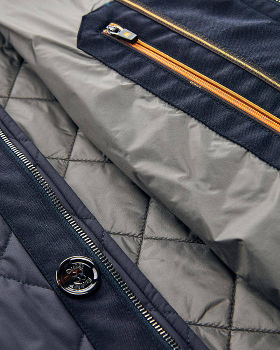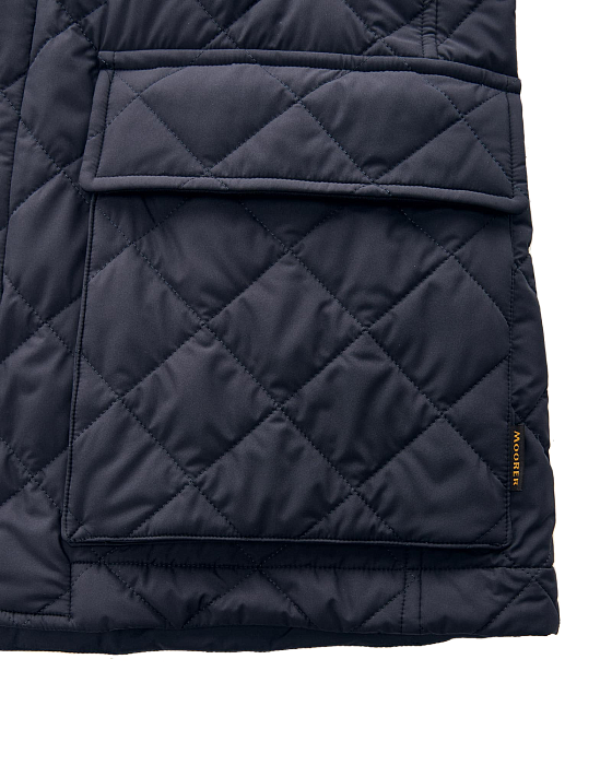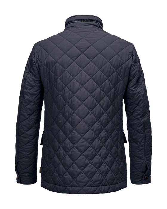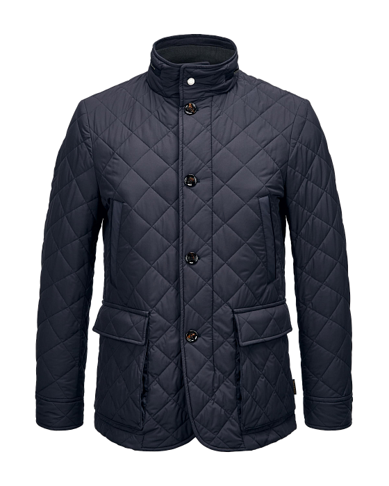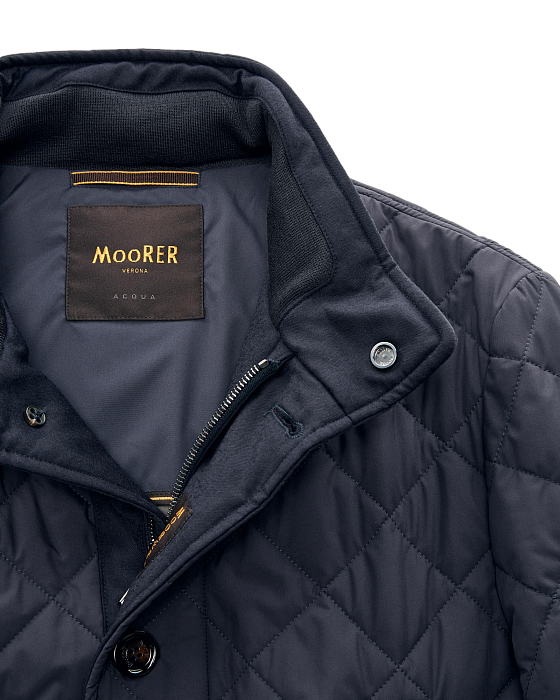 Lightweight quilted jacket by Moorer with button and zip fastening. Made of water-repellent technical fabric with diamond stitching. Features include a stand-up collar with a snap button, flap pockets, adjustable cuffs, and multiple inner pockets. Padded for optimal warmth and comfort.