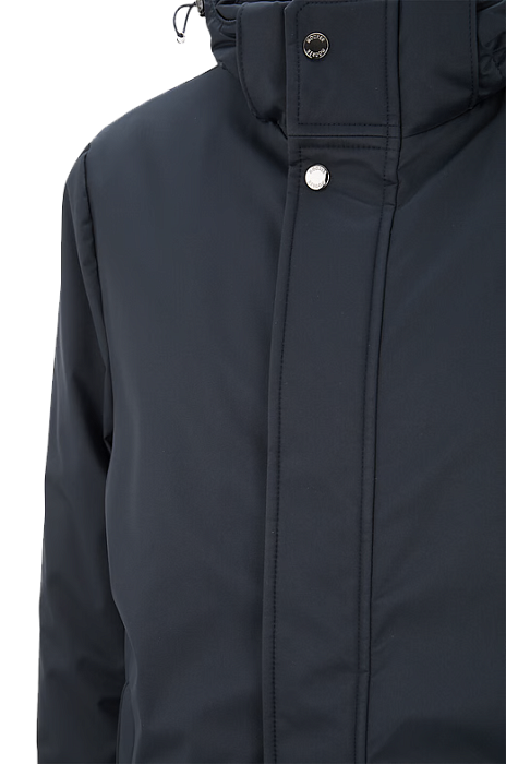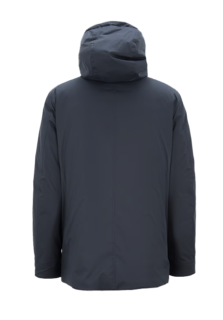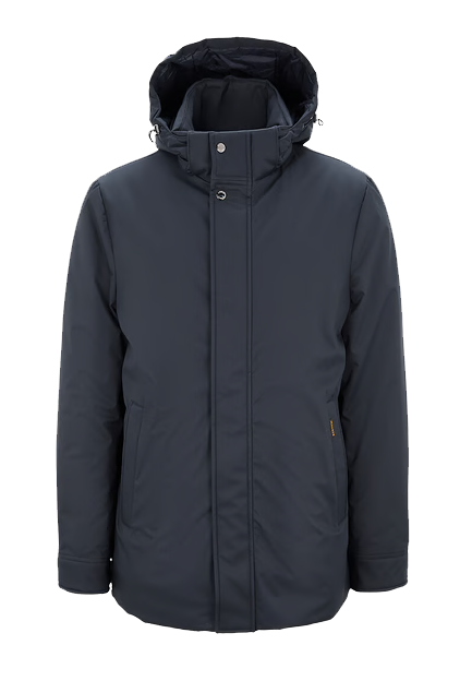Padded jacket by Moorer crafted from a high-performance technical fabric blend with a matte finish. Designed with an essential urban silhouette, this model features a detachable hood, front closure with zip and press studs, and functional welt pockets. Insulated and water-repellent, it ensures comfort and warmth throughout the cold season.